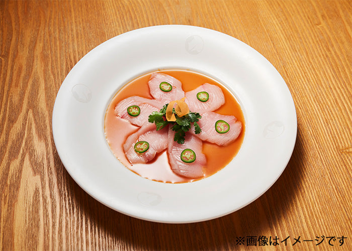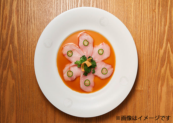 (Yellowtail Sashimi set in Yuzu Soy Sauce with Thinly Sliced Jalapeno, Garlic Paste and Coriander)
