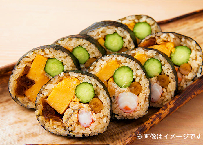 車海老、穴子、玉子焼きなど一つ一つ丁寧に仕込んだ具材をボリュームたっぷりに巻き上げました。胡瓜と山牛蒡の食感がアクセントになっています。海苔は有明海のうまみたっぷり極厚のりを使用。それぞれの食材の旨みと、赤シャリとの絶妙な調和をぜひ味わってみてください。